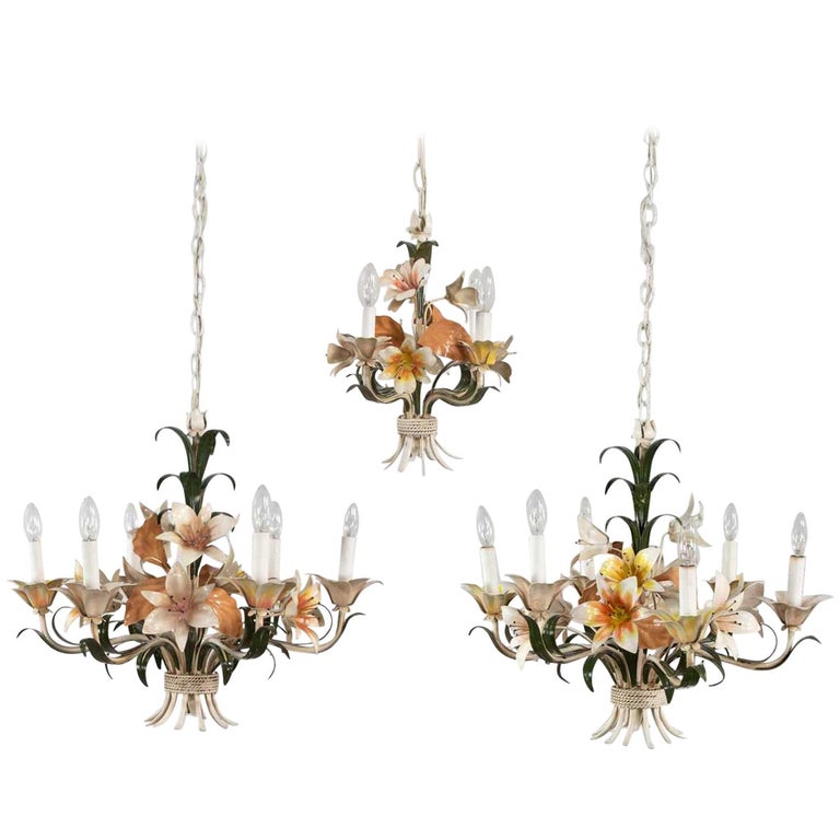 Trio Vintage Tole Painted Floral Chandeliers 2 With 6 Light And 1 With 3 Light At 1stdibs