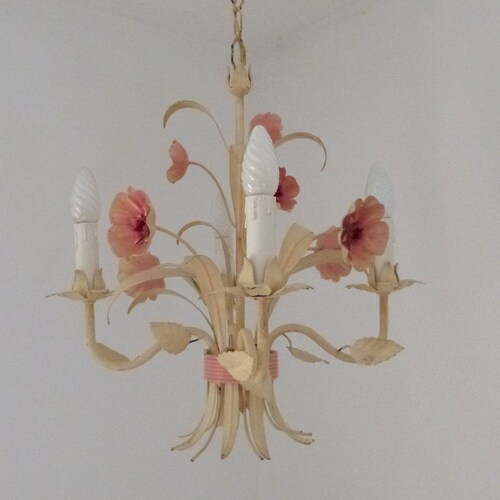 Vintage French Toleware Tole Chandelier Lamp W Pink Flowers Etsy